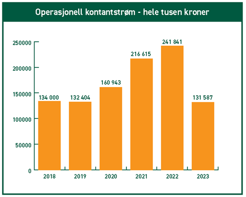 Konsernets kontantstrøm fra operasjonelle aktiviteter har i 2023 vært 131,6 mill. kroner, mot 241,8 mill. kroner i 2022. Netto kontantstrøm fra investeringsaktivitet var på -395,3 mill. kroner, mot -248,9 mill. kroner i 2022, mens finansaktivitetene bidro med en netto kontantstrøm på 298,3 mill. kroner, mot -10,2 mill. kroner i 2022.