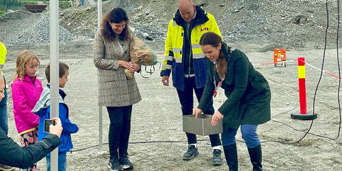 Grunnsteinen for biogassanlegget på Voss legges ned av ordfører i Voss herad, Tonje Såkvitne, 27. august. Grunnsteinen inneholder tegninger fra tredje klasse på Palmafossen skule, dagens utgave av Avisa Hordaland, arkitekttegninger av biogassanlegget, en matavfallspose og dokument signert av samarbeidspartene.