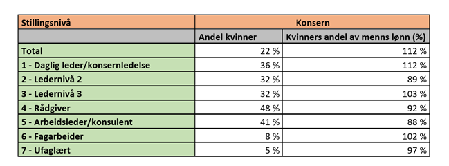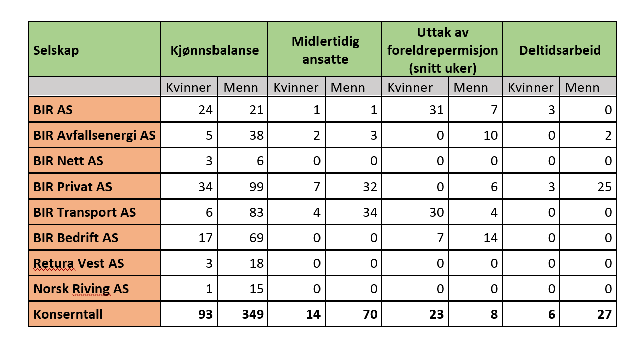 Andelen kvinner i faste stillinger var 19,8 prosent i 2024. Dette er en nedgang fra 2023. Det er imidlertid variasjoner på tvers av konsernet, der noen selskap har høyere kvinneandel. 22,7% av ledere med personalansvar i BIR er kvinner og i konsernledelsen er det 3 kvinner og 7 menn. BIR har en målsetting om å oppnå en god kjønnsbalanse og jobber målrettet for å øke andelen kvinner i stillinger som tradisjonelt har vært dominert av menn.