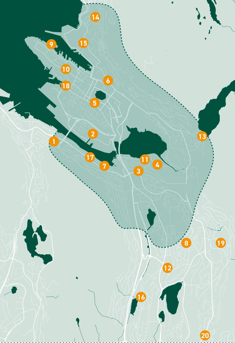 Hentebilen kjører innenfor den avmerkede sonen på kartet. De oransje prikkene viser miljøbussenes stoppesteder.