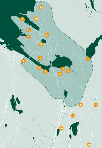 Nummeret foran stoppet finner du igjen i kartet lengre nede på denne siden.