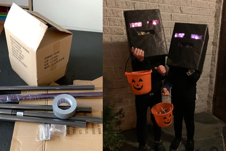DIY og gjenbruk: På et par timer ble noen tomme pappkasser donert fra nærbutikken gjort om til to Enderman-kostymer ved hjelp av tape, sort papir, et par lysslynger og lilla folie, pluss sorte gensere og bukser fra skapet.
