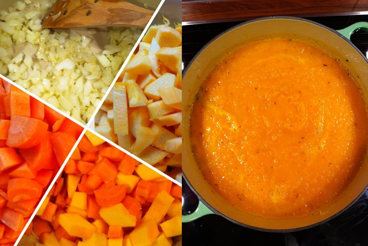 Skrell og kutt opp grønnsakene (gresskar, løk, hvitløk og ev. gulrot). Fjern skall og frø fra gresskaret. Frøene kan ristes lett i panne eller ovn og brukes som tilbehør, alene eller finhakkes sammen med andre nøtter og blandes med smør til et nøttesmør.