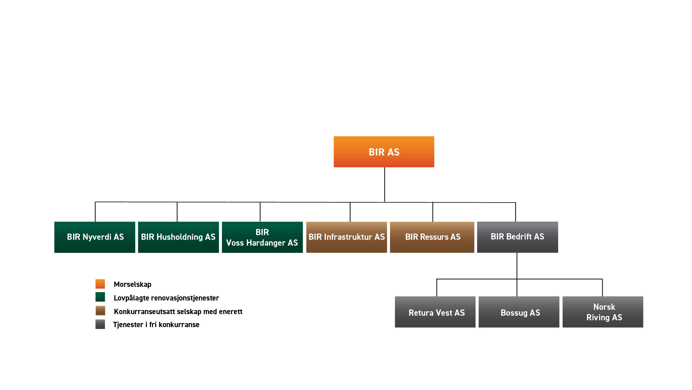Innenfor den ene delen ligger utførelsen av de lovpålagte renovasjonsoppgavene knyttet til innsamling, gjenvinning og behandling av husholdningsavfall. Det er BIR Husholdning, BIR Infrastruktur, BIR Nyverdi og BIR Ressurs som utfører disse tjenestene for BIRs eierkommuner. BIR Bedrift tilbyr sine tjenester i markedet i konkurranse med andre tilbydere.