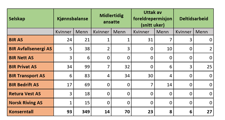Andelen kvinner i faste stillinger var 19,8 prosent i 2024. Dette er en nedgang fra 2023. Det er imidlertid variasjoner på tvers av konsernet, der noen selskap har høyere kvinneandel. 22,7% av ledere med personalansvar i BIR er kvinner og i konsernledelsen er det 3 kvinner og 7 menn. BIR har en målsetting om å oppnå en god kjønnsbalanse og jobber målrettet for å øke andelen kvinner i stillinger som tradisjonelt har vært dominert av menn.